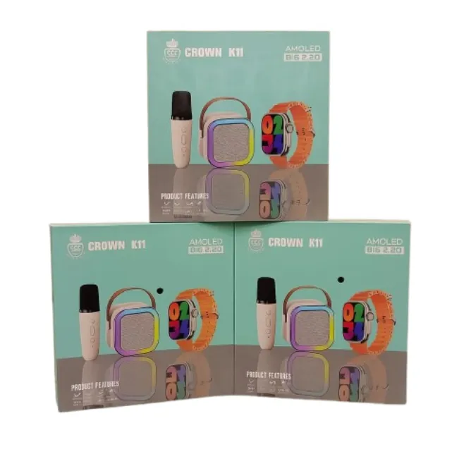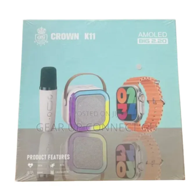 This is the Crown K11 3-in-1 Smart Combo Set, which includes a smartwatch, a portable Bluetooth speaker, and a wireless microphone.