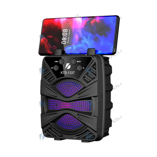 Design: The speaker is black and includes built-in RGB LED lights that change color, adding a visual effect to the music. It also has a handle for portability.