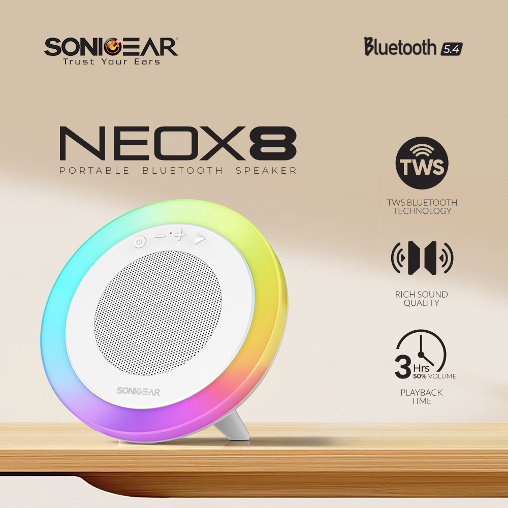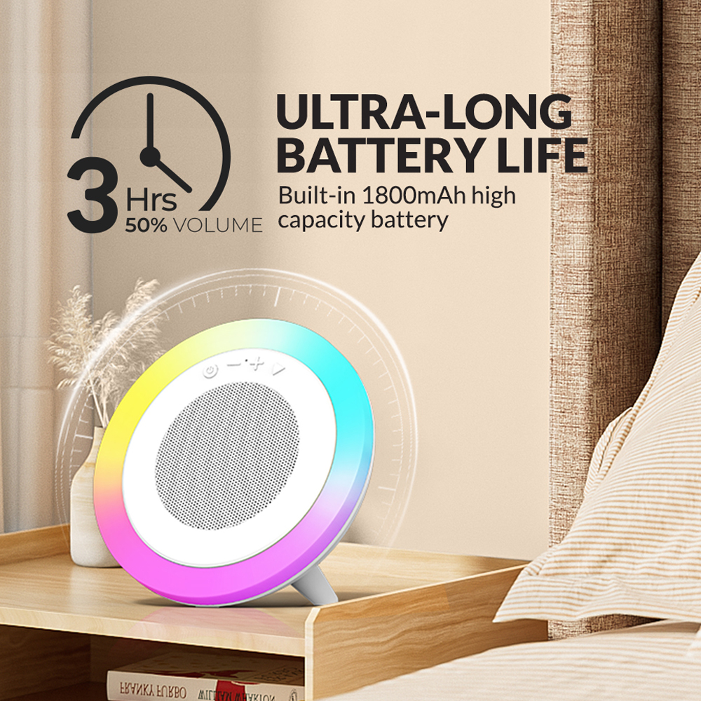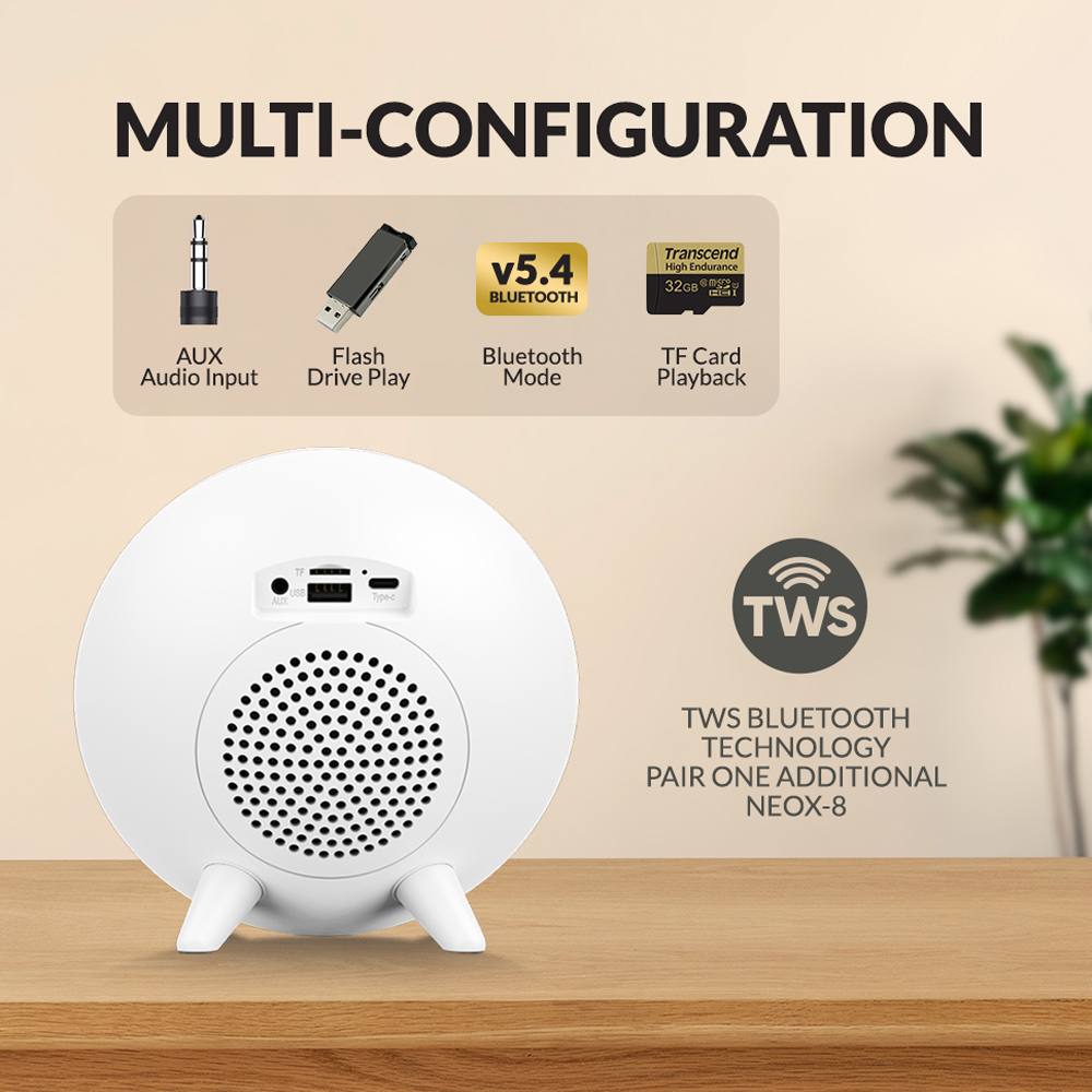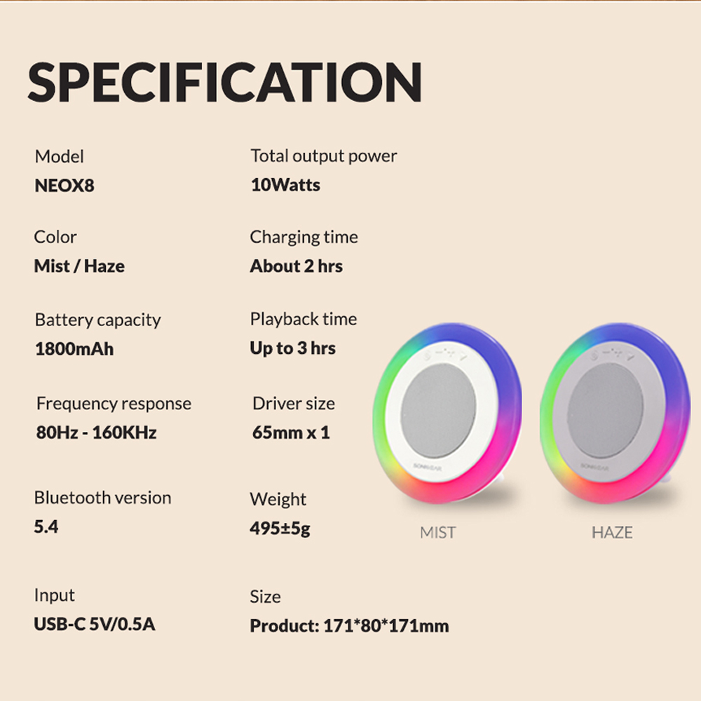 Specifications | - Bluetooth Version: 5.4 - Bluetooth Receiving Distance: >10m - Output Power (RMS): 5W x 2 - Speaker Size: 171 x 80 x 171 mm - Frequency Response: 80Hz – 160 KHz - Power Supply: USB 5V/0.5A - Battery Capacity: 1800mAh - Playback Time: 3 Hours @ 50% Volume Level |