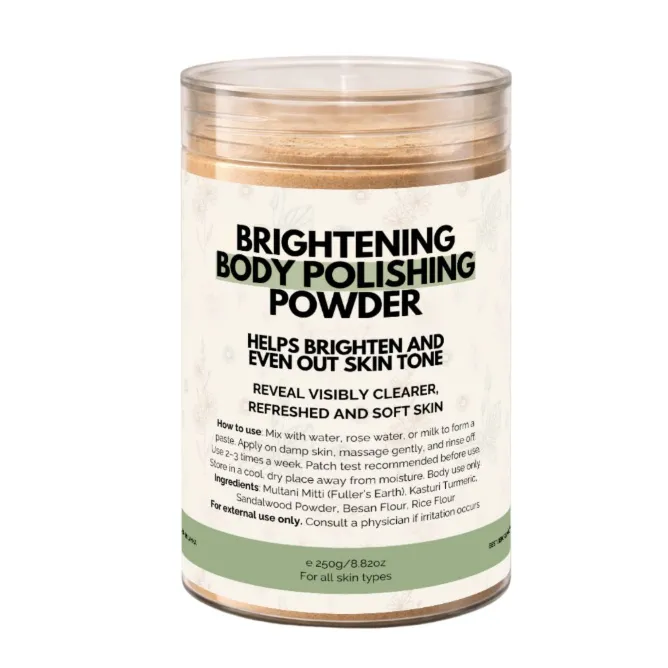Gently exfoliate and refresh dull body skin with this Brightening Body Polishing Powder. Crafted with a blend of Chickpea Flour and Rice Flour, this traditional powder cleanser helps polish away dead skin cells, dirt, and daily buildup to reveal smoother-looking skin. Multani Mitti helps cleanse and absorb excess oil, while Kasturi Turmeric supports a brighter, more even-looking tone. Sandalwood Powder adds a soothing touch, helping leave skin feeling calm and refreshed after use. When mixed with water, rose water, or milk, the powder transforms into a gentle paste that cleanses without over-drying, making it ideal for regular body care. With continued use, skin feels softer, smoother, and naturally radiant.