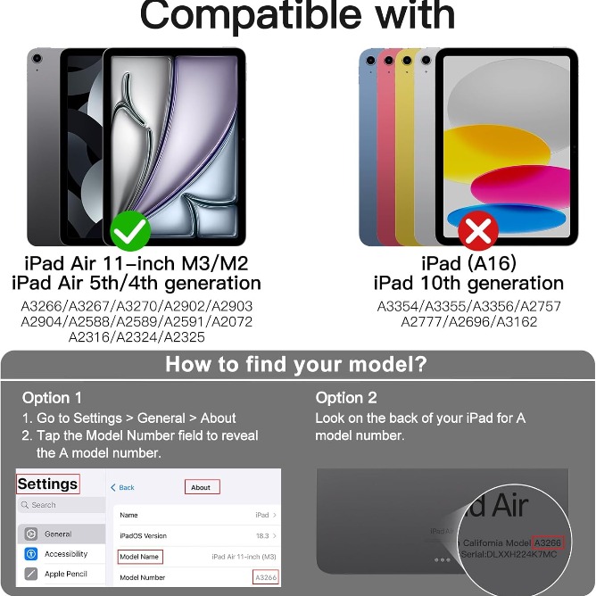 [Compatibility] NOT for iPad (A16) 11th/10th Generation (2025/2022). Supports Pencil Pro/Pencil(USB-C). Designed for iPad Air 11-Inch M3/M2 (2025/2024), iPad Air 5/4 (2022/2020 5th/4th Generation 10.9-Inch). Fits iPad Models: A3266 / A3267 / A3270 / A2902 / A2903 / A2904 / A2588 / A2589 / A2591 / A2324 / A2072 / A2316 / A2325. Please Go to Settings > General > About, then tap the Model Number field to reveal the A model number