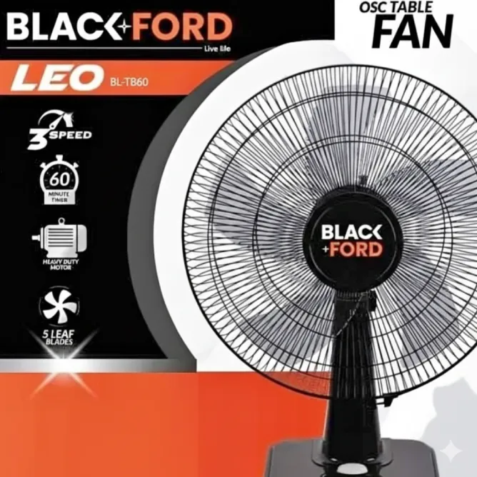 Stay cool and comfortable with the Black Ford Table Fan BL-TB60 — a reliable and stylish cooling solution perfect for your home, office, or shop. Designed with a powerful motor and efficient blades, this table fan delivers strong, consistent airflow to keep your space refreshed even on the hottest days.