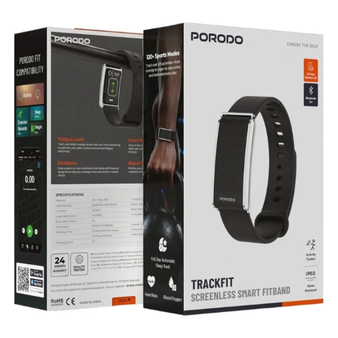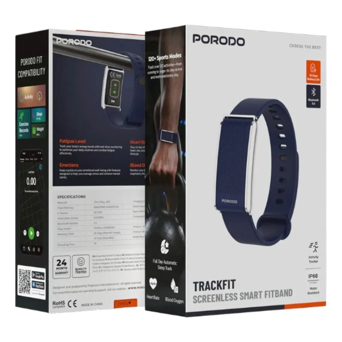 The Porodo TrackFit Smart Fitness Band is built to keep up with your active lifestyle, combining durability and smart performance in a sleek design. Crafted from Zinc Alloy + ABS Plastic, it features Bluetooth 5.4 connectivity for a stable connection and a 110mAh battery delivering up to 30 days of normal use and 40 days standby time. Compatible with Android 8.0+ and iOS 12+, it ensures smooth everyday performance.