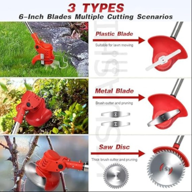 Cord less Grass Cutter And Trimmer : Equipped with 2 types blade: 5.5 inch Round manganese Steel Saw Blades for trim thick shrub branches/heavy bush (a thickness of about 1-2 inch), Stainless steel metal blades for for cutting soft grass/small grass and quickly mowing lawns,dense grass, weeds, small shrubs; Durable metal blade allows you to cut through dense vegetation and grass in less.