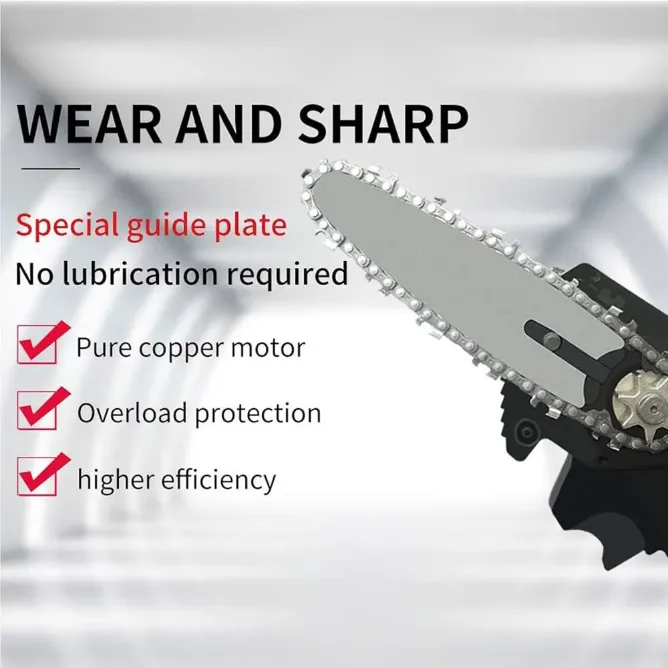 Strong Dynamic System -- 24V cordless chain saw adopt All copper motor which can deliever no loss strong power to make cutting efficiency more higher and faster. Large-capacity lithium batt-ery can provide sufficient power, continuous outdoor working demands.