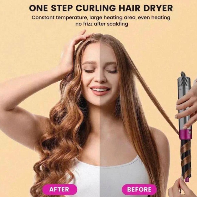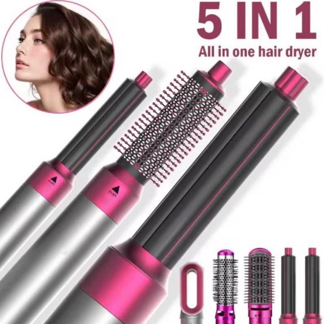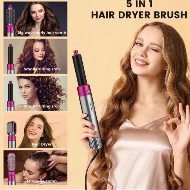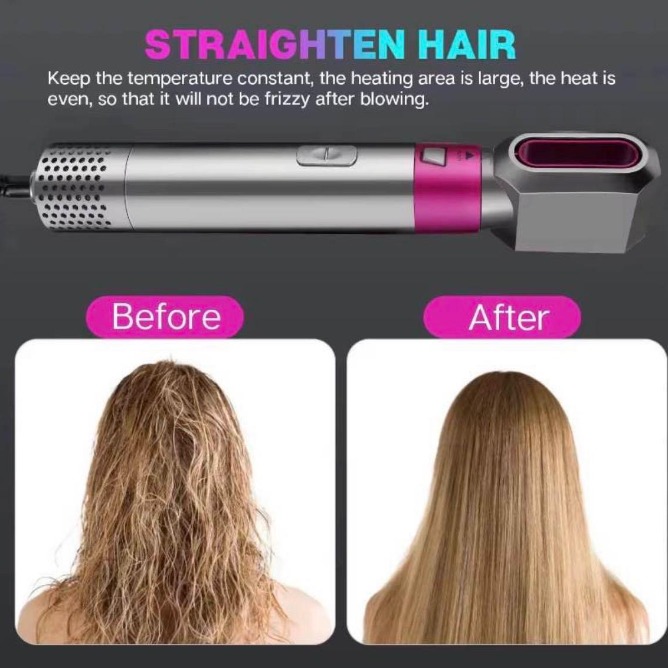 Specifications: Functions: Hair Dryer, Straightener, Curler, Volumizer, Massage Comb; Temperature: 3 heat levels; Technology: Negative ion, constant temp, anti-frizz; Design: Lightweight, ergonomic, anti-static bristles; Suitable For: All hair types; Package Includes: 5 attachments + main handle.