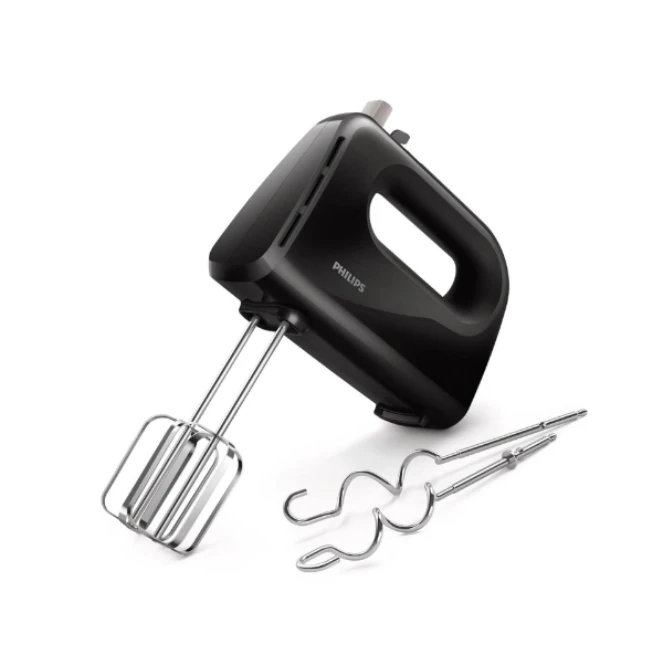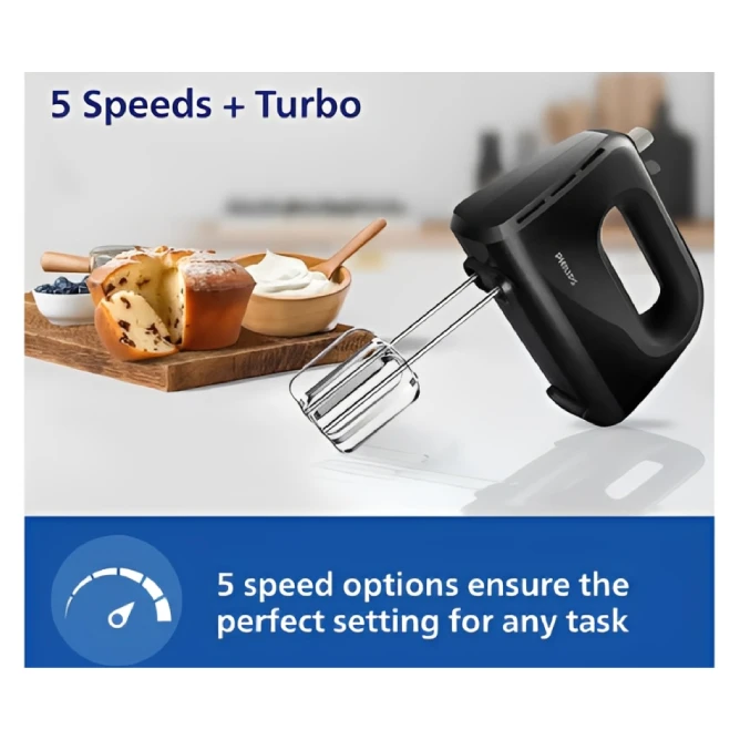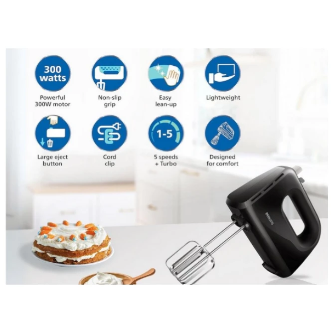 Make mixing easy with the Philips Daily Hand Mixer HR3705/10. Its powerful 300 W motor and 5 speeds + Turbo help you blend batters and dough quickly. Lightweight and ergonomic with non-slip grip, it includes stainless steel beaters and dough hooks. Easy cleaning and tidy storage make baking joyful at home.