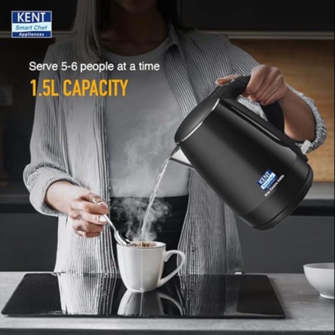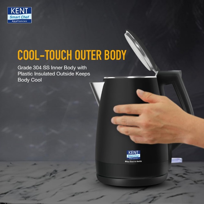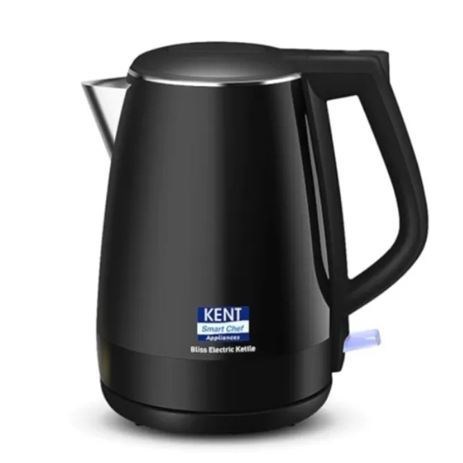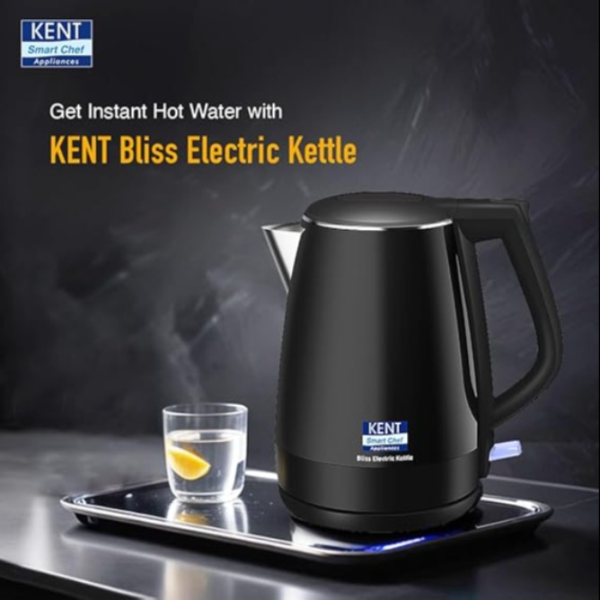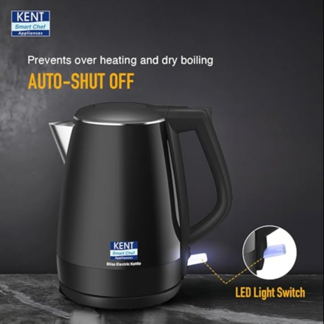The KENT Kent Kettle Bliss 1.5L has a 1500W power rating, a stainless steel body, and a cool-touch exterior. Key features include a 1.5-liter capacity, fast 5-minute boiling time, and safety functions like auto shut-off and overheat/dry boiling protection. It also has a 360° cordless base and an LED light switch.