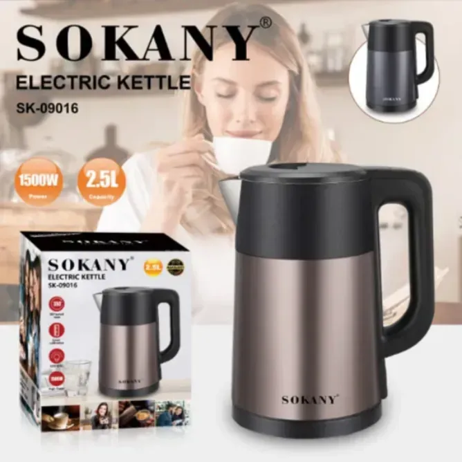 Experience convenience with the Sokany electric kettle, featuring a 2.5-liter capacity, automatic shut-off, and a removable, washable filter. Its concealed stainless steel heating element ensures quick boiling while the 360° cordless base provides easy handling. Perfect for quick hot water needs in your kitchen.