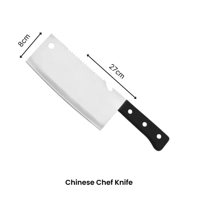 Chinese Chef Knife (Made in China) – Measuring 27cm (Length) and 8cm (Width), this knife is perfect for slicing meat, vegetables, and herbs with precision.
