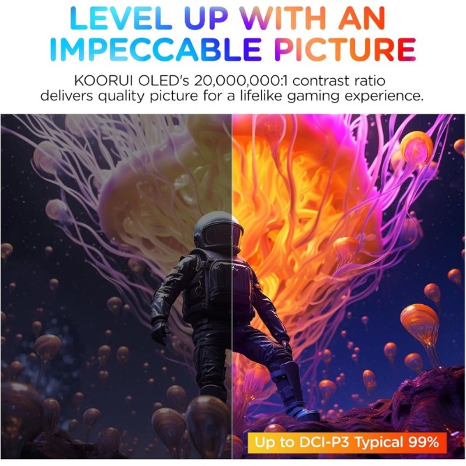 Stunning OLED Visuals – 27" QHD Display: Experience ultra-sharp, lifelike images with the KOORUI S2721XO. Its 27-inch OLED screen delivers true QHD (2560x1440) resolution, deep blacks, and vibrant colors—perfect for competitive gaming and immersive entertainment.