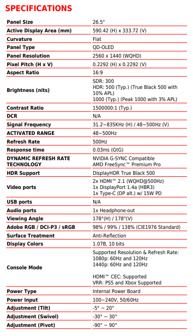 MSI Mag 272Qp Qd Oled X50 26.5 Inch 500Hz Wqhd Monitor