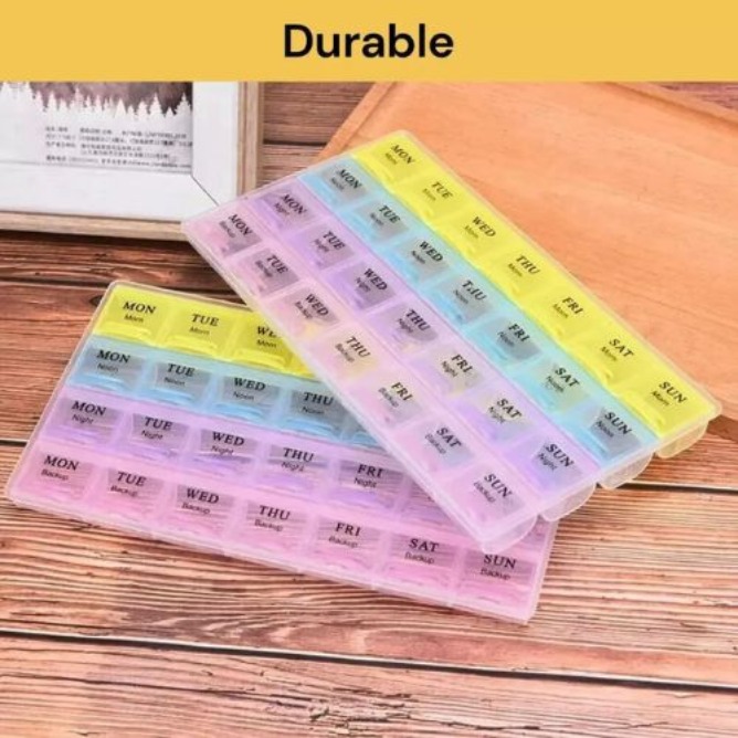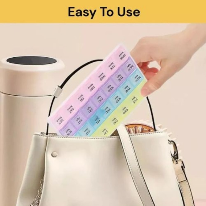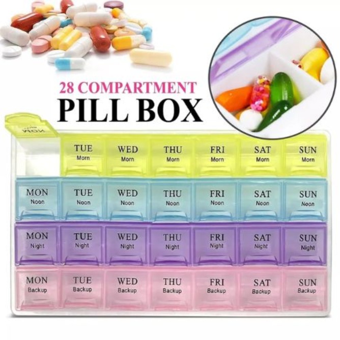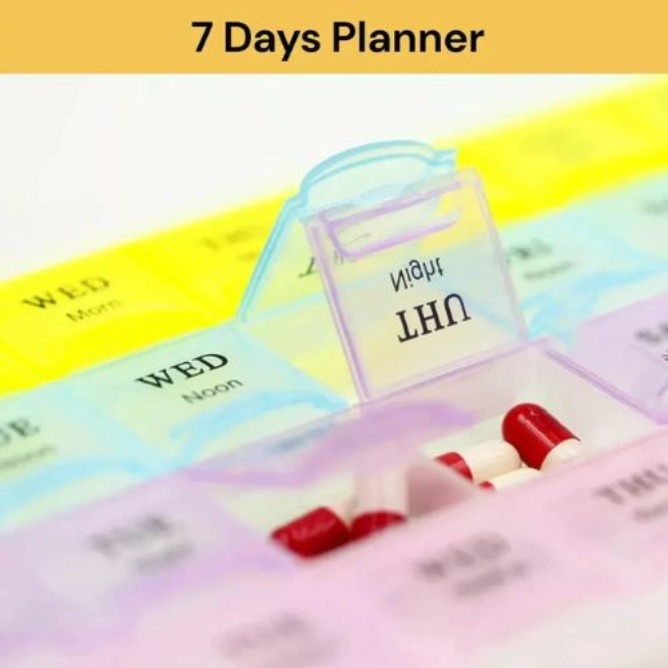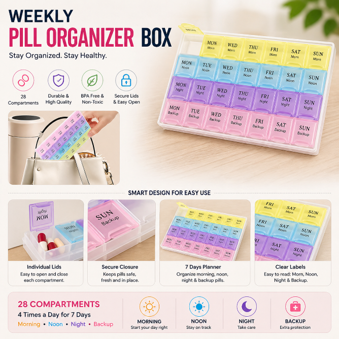 Stay organized and take control of your daily health routine with this Weekly Pill Organizer Box. Designed with 28 compartments, it allows you to neatly arrange your medication for 7 days × 4 times a day (Morning, Noon, Night & Backup).