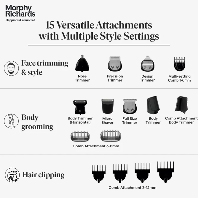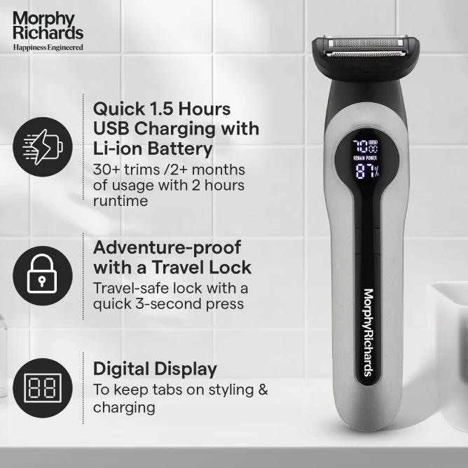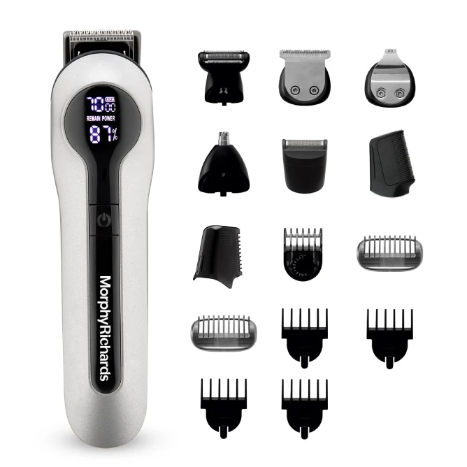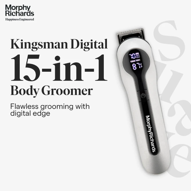 Master your look from head to toe with the Morphy Richards Kingsman Digital 15-in-1 Grooming Kit. This all-in-one grooming powerhouse is engineered to handle everything from precision beard styling and hair clipping to full-body grooming and sensitive detailing.