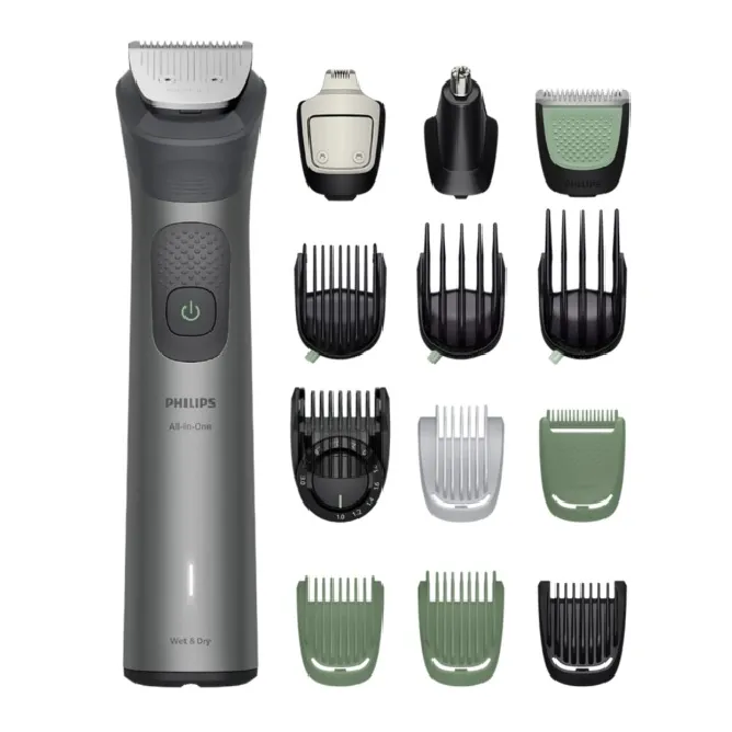 Experience ultimate grooming versatility with the Philips 15-in-1 Trimmer Series 7000 MG7935/15, designed for face, hair, and body. Its 15 specialized tools include a metal trimmer, nose trimmer, detail trimmer, body trimmer, and BeardSense technology, giving you professional-level precision at home. Achieve exact styling with 26 length settings (0.5–20 mm) and precision control up to 0.2 mm.
