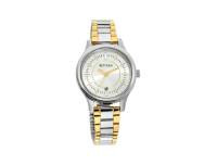 This analog watch for women features a white round dial, housed in a brass case. Three plain hands and round gold indications at regular intervals make time reading easy. Its metallic, gold strap is made of stainless steel and comes with a special three piece sliding clasp.