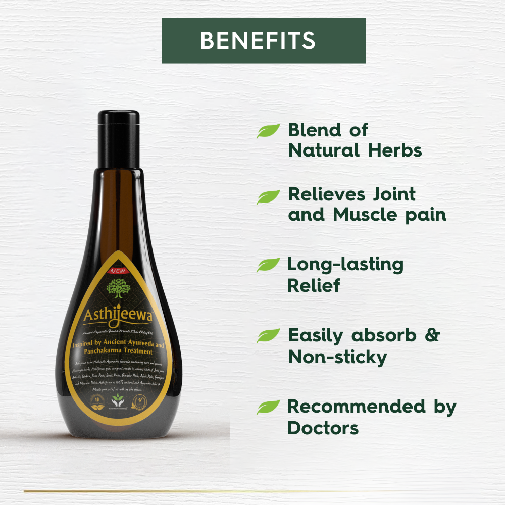 Asthijeewa Ayurvedic Pain Relief Oil is proven to give quick and long-lasting relief from pain in 2-3 weeks. Regular usage treats the pain permanently. The unique formulation of acts upon the root cause of pain and heals problems related to joint, muscle & bone pain to synovial fluid issues.
