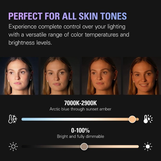 2900 – 7000 K: change color temperature from sunset amber to arctic blue.