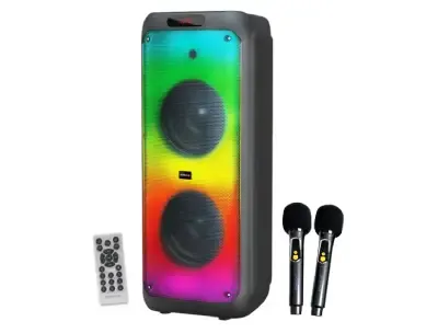 Portable party speaker with powerful 100W sound, built-in dynamic light show, and splash proof design.