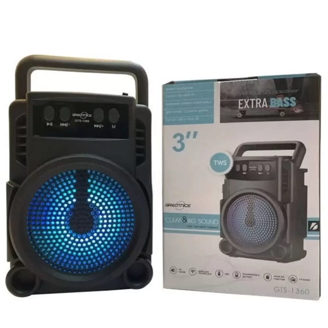 The item is a Greatnice GTS-1360 wireless speaker, a portable 3-inch Bluetooth loudspeaker.
