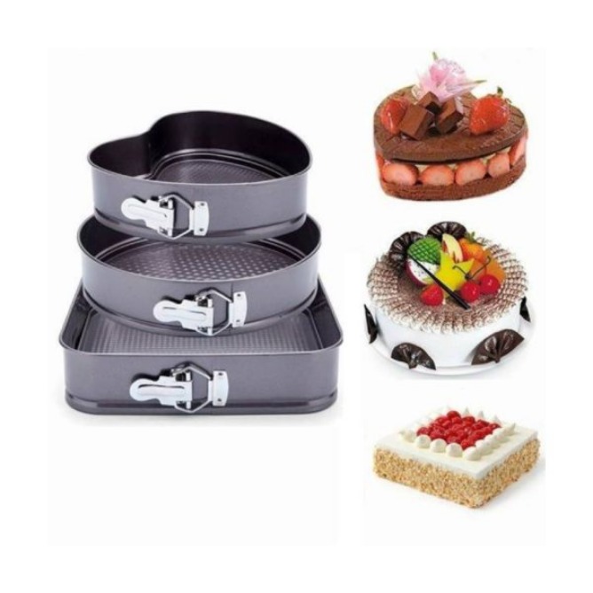 A 3-shape cake mold is a set of three baking pans that come in different forms, such as round, square, and heart, to offer variety for baking projects. They are typically made of non-stick, durable materials like steel or aluminum for even heat distribution and easy cake release and cleanup. Many sets include a springform or removable base for easy unmolding.