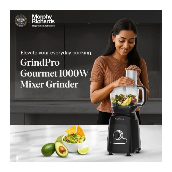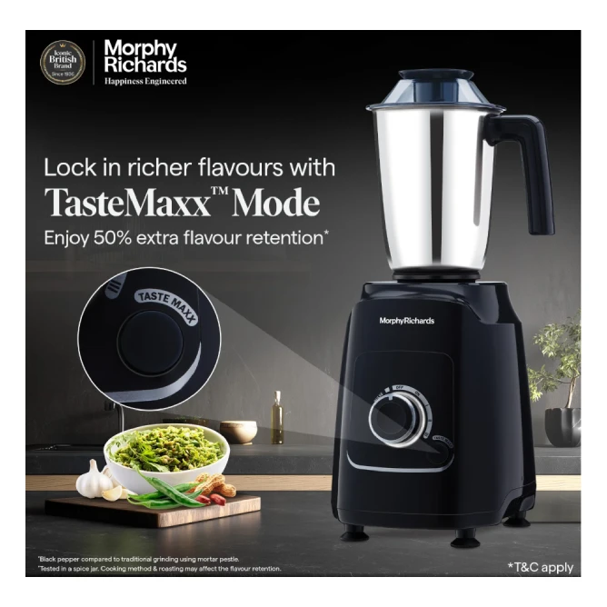 Power through your everyday cooking with this high-performance kitchen companion. The 1000W copper motor spins at 20,000 RPM to grind even tough ingredients like turmeric in just 60 seconds, while Taste Maxx Mode helps retain 50% more flavour. The 0.2L spice jar is perfect for fresh masalas and ginger-garlic pastes, and the 2.2L multi-functional food processor attachment handles atta kneading, chopping, grating, slicing, coconut scraping, and citrus juicing with ease. Compact, powerful, and built for daily use.