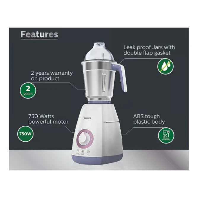 The Refurbished Philips Mixer Grinder HL7701/01 with a powerful 750W motor handles tough grinding with ease. It includes four versatile jars for wet, dry and juice tasks, secure leakproof jars, ergonomic handles and easyuse controls. Compact and reliable, it’s a great choice for everyday kitchen prep.