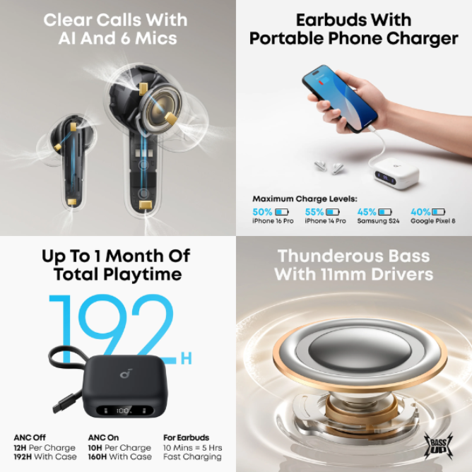 Experience the power of innovation with the soundcore P41i, the world’s first earbuds with built-in phone charging. Equipped with a 3,000mAh case that delivers 10W output, it can charge your iPhone 16 Pro to 50% or Samsung S24 to 45%, keeping your music and your phone powered wherever you go. Enjoy up to 12 hours of playback per charge and a massive 192 hours total with the case—plus a 10-minute quick charge gives you 5 hours of listening.