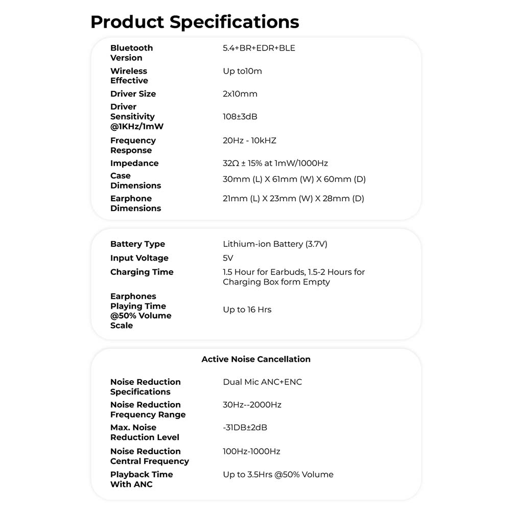 | Playback Time with ANC (@ 50% Volume) | Up to 3.5 hours |