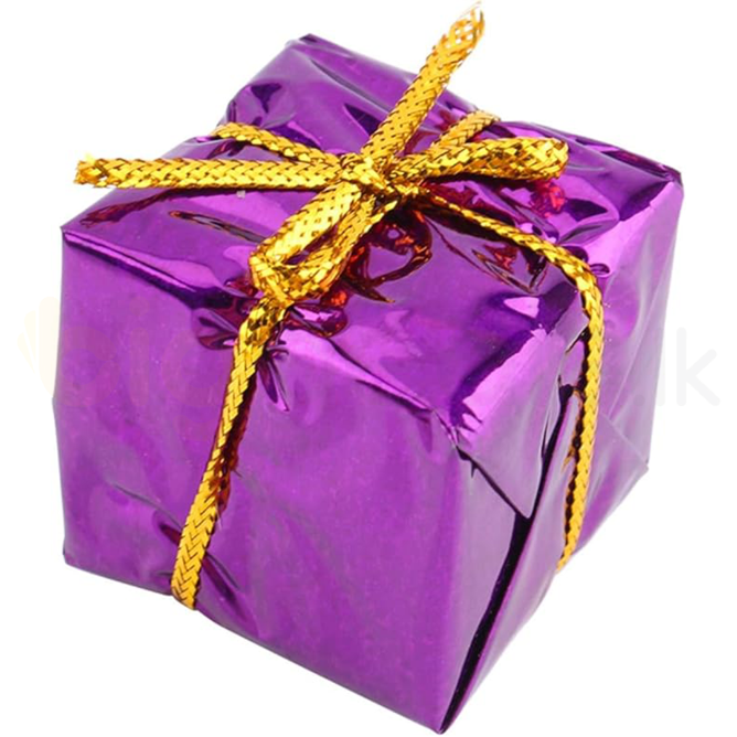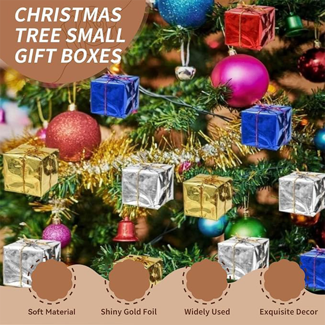 Enhance your holiday decor with this 12-piece set of mini candy box ornaments. Each small box is handmade and wrapped in shiny metallic foil, creating a festive and vibrant look for your Christmas tree or table display.