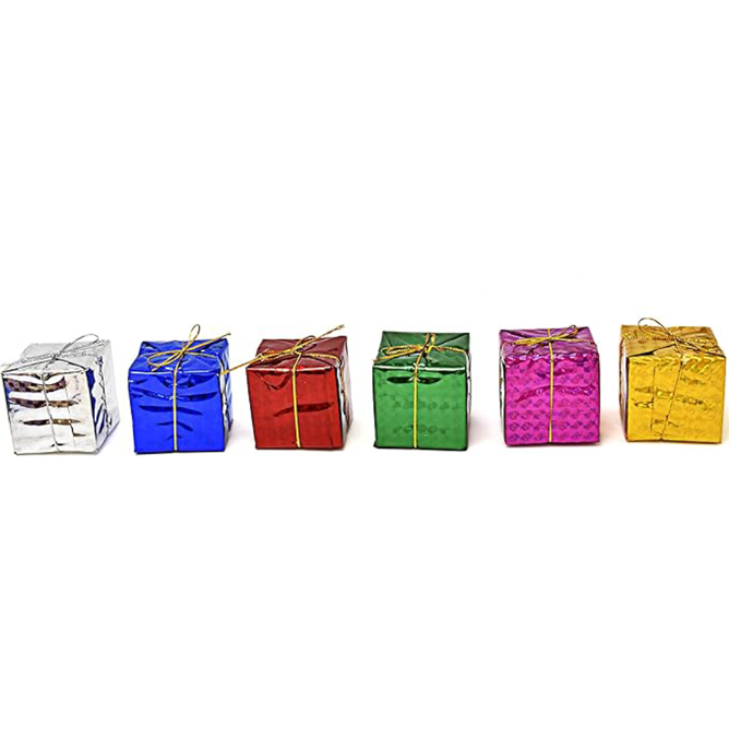 Bring a festive and playful touch to your holiday decor with this 6-piece set of mini candy box ornaments. Each ornament is handmade and wrapped in shiny metallic foil, adding vibrant colour and sparkle to your Christmas tree or table display.