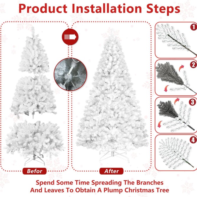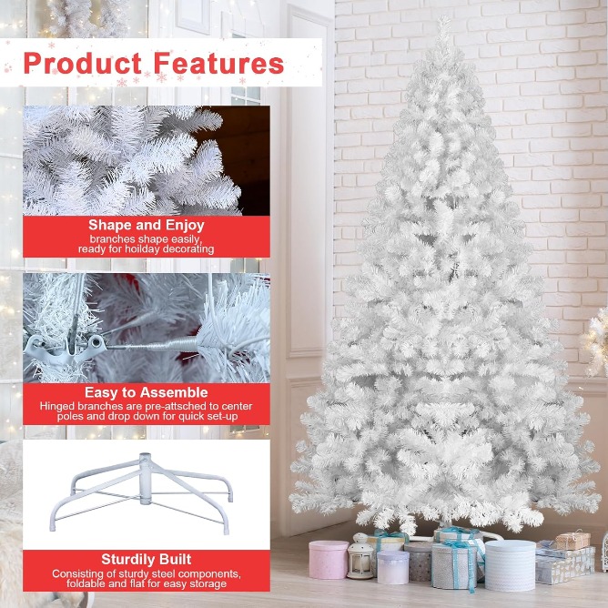 【EXCELLENT MATERIAL】The plump needles of this lifelike fir White Christmas tree are made of flame retardant pvc material, excellent crush-resistant qualities make the tree more durable, not easy to fall off, and always keep the complete appearance and neatness, thousands of firm branches create display space for your favorite decorations and lights to create a personalized look. Equipped with a foldable metal base.
