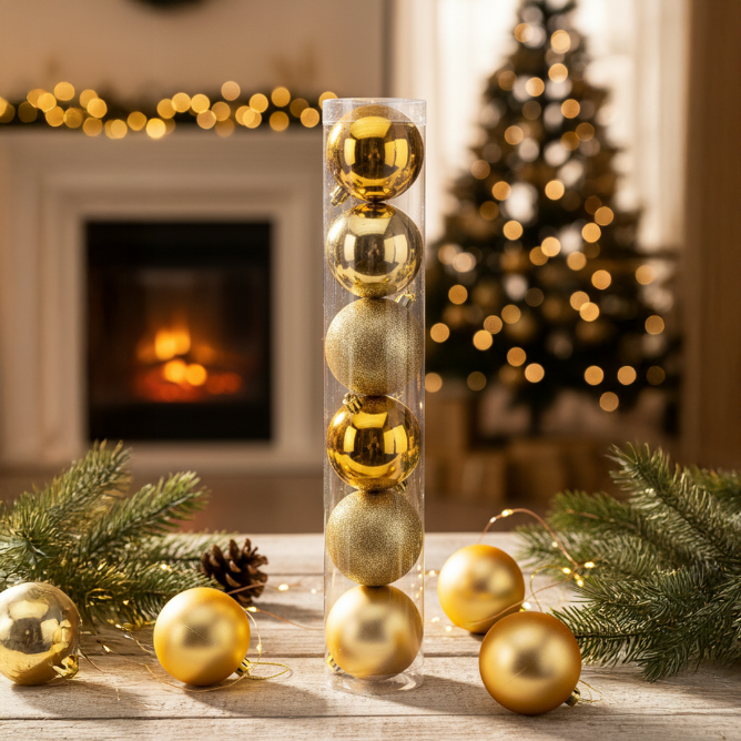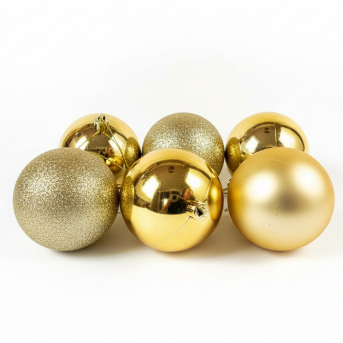 Bring timeless elegance to your festive decor with this 6-piece set of gold Christmas baubles. Crafted from durable, shatterproof plastic, these ornaments are lightweight, safe, and ideal for Christmas trees, wreaths, garlands, or holiday center pieces.