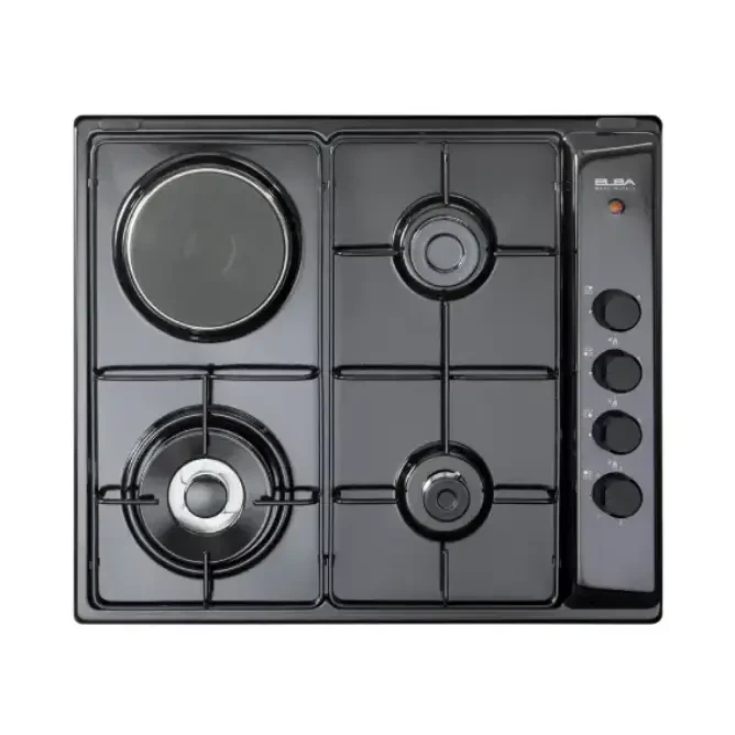 The ELBA- HOB 3 Gas + 1 ElecTric With Safety - 60cm - Black combines the versatility of three gas burners and one electric hotplate in a sleek 60 cm design. Made with durable black glass and stainless steel, it offers both modern style and reliable functionality. Equipped with advanced safety features, including a flame failure device, safety cut-off, and indicator light, this hob ensures safe cooking. Its electronic ignition and enameled steel pan supports make cooking easy and efficient. Ideal for modern kitchens, it provides flexibility and high performance in a compact, stylish package