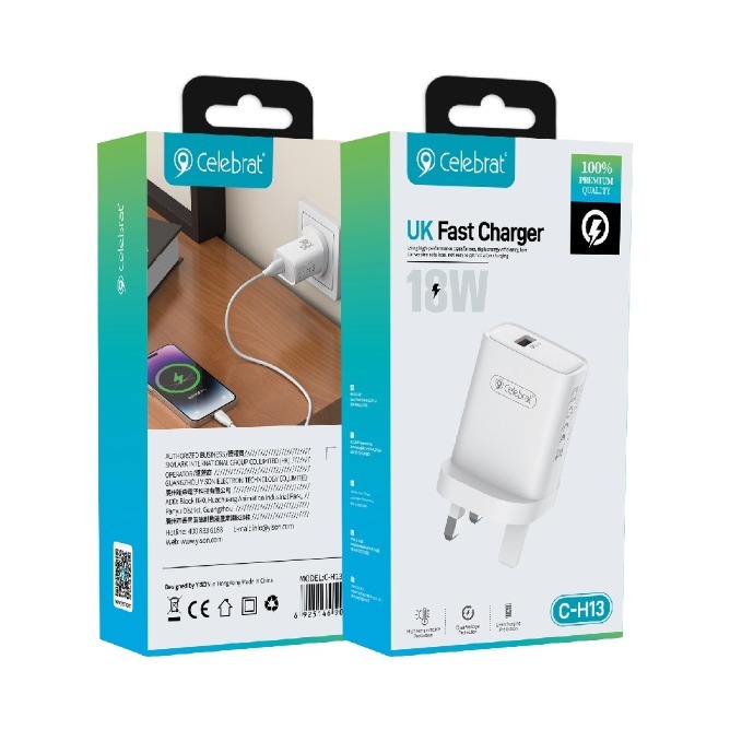 The Celebrat C-H13 is a compact 18W UK fast charger featuring smart chip technology for safe, rapid power delivery. Built with fireproof materials and integrated safety protections, it offers reliable and efficient charging for all your devices.