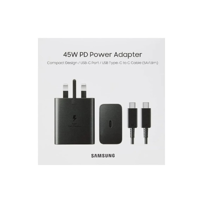 The Samsung 45W Super Fast Charging Adapter offers rapid charging for compatible Samsung devices. With USB-C PD 3.0 and PPS (Programmable Power Supply) technology, it delivers up to 45W of power, making it ideal for charging newer models like Galaxy S10 5G, Galaxy Note10, Galaxy S20 Ultra, S22 Ultra, and more. The adapter comes with a USB-C to USB-C cable and supports multiple output voltages to ensure safe and efficient charging across devices. It also features low standby power consumption, ensuring energy efficiency when not in use.