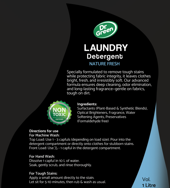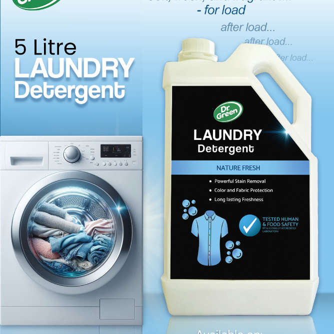 Dr. Green Laundry Detergent (05L) is a high-performance liquid detergent formulated to deliver deep cleaning while caring for your fabrics and leaving a refreshing fragrance. Designed for everyday laundry needs, it effectively removes dirt, stains, and odors, leaving clothes brilliantly clean and delightfully scented.