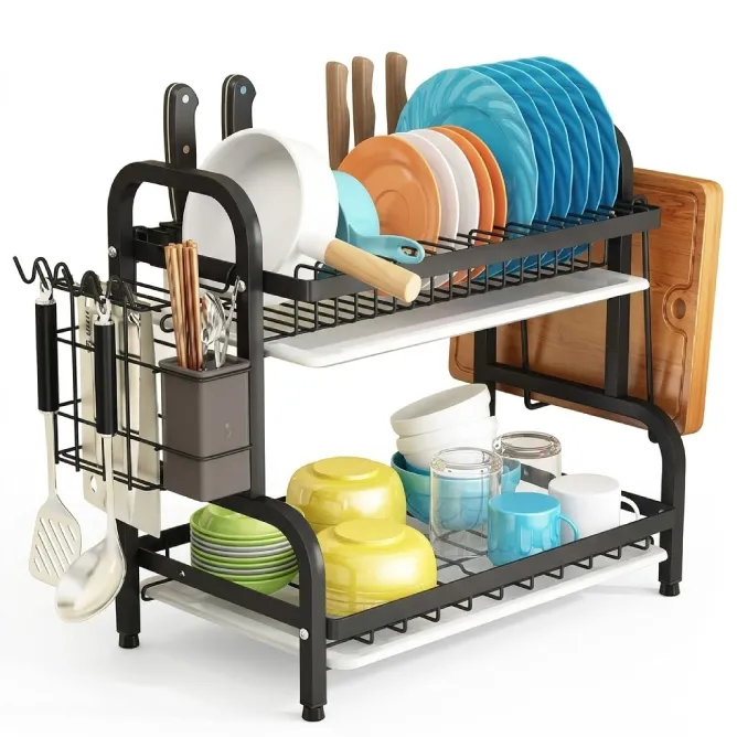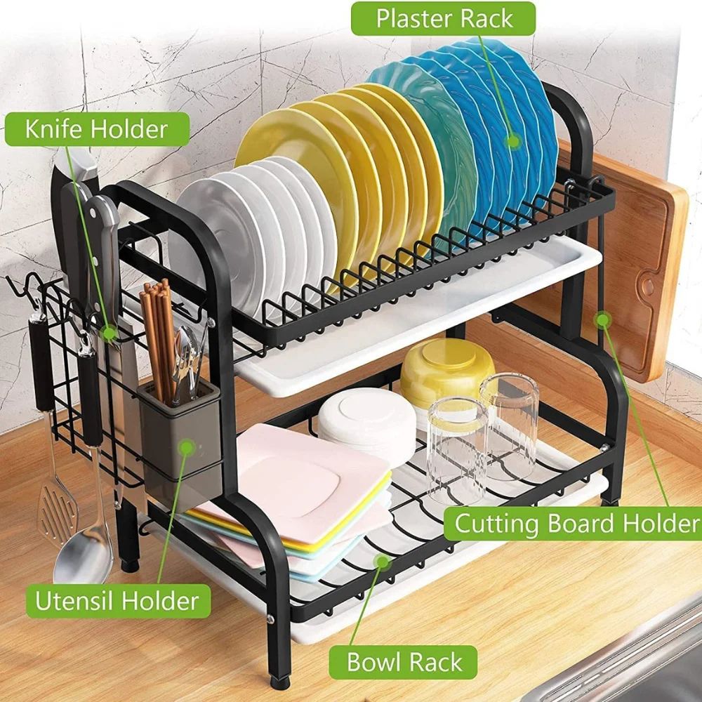 Anti-Rust Steel- The 2-tier dish rack crafted from robust steel with an anti-rust baking varnish is durable, oil-resistant, and rust-free. It is a water scale that appears as "rust" on the shelf. And remove with a wipe. The raised dish dryer sits on four supporting points. Non-slip synthetic rubber feet caps (need installation) featuring non-slip for stable storage. Also, rubber caps prevent scratching, noise, and make the steel non-heat-conducting