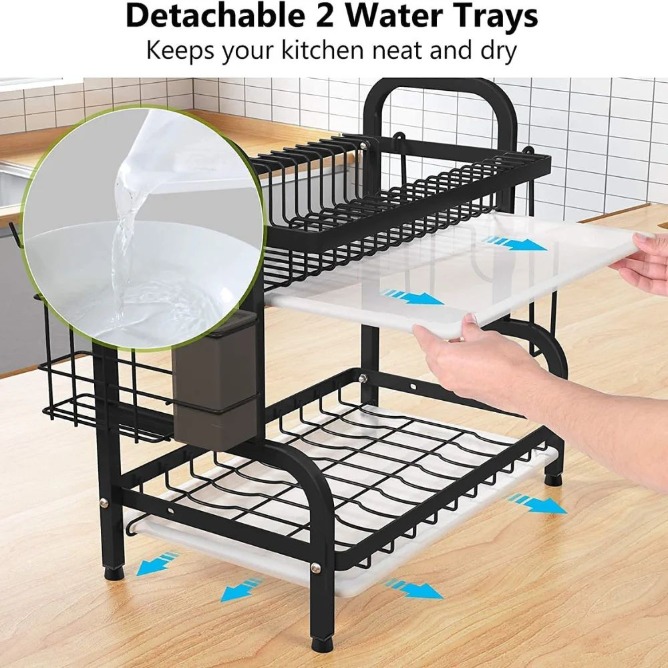 Modern Style - This organizer promotes a concise and contemporary style with clean, smooth lines. A stylish and practical addition to any kitchen style allows you more storage. Elevated feet protect the tabletop surface and reduce noise from plates and cutlery. Two pull-out water pans at the bottom of the dish drying rack absorb additional drips from the dish holder. It's easy to clean and won't get your countertop wet