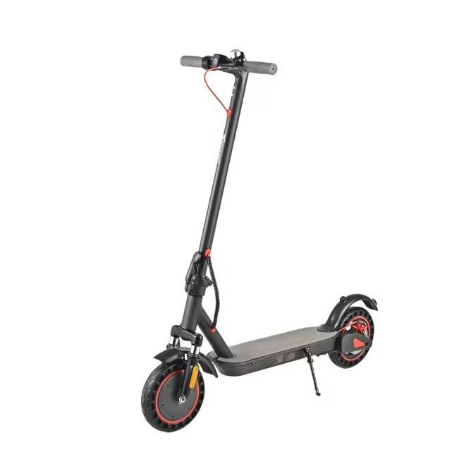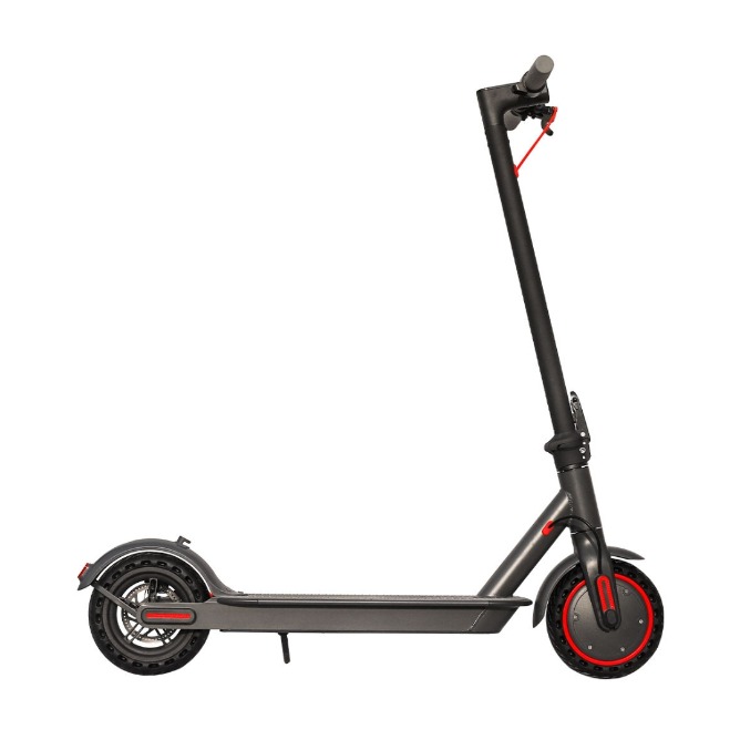 Tires: The scooter uses 10-inch wheels (featuring red reflector accents on the wheel hubs) designed to safely navigate various terrains, including speed bumps and sandy paths.
