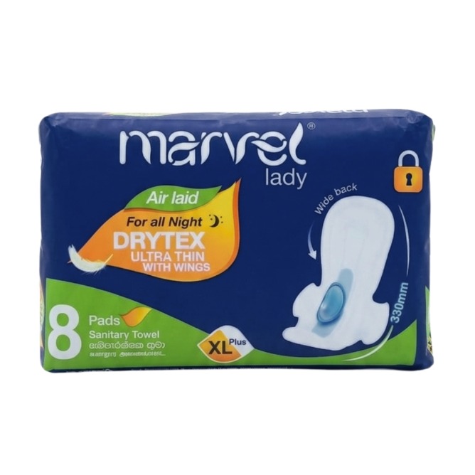 Marvel Lady Ultra Thin Sanitary Pads (XL – All Night) are designed to provide maximum overnight protection with a slim, comfortable fit. They feature high absorbency and secure wings to prevent leakage, helping you stay dry and confident throughout the night.