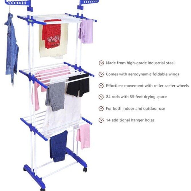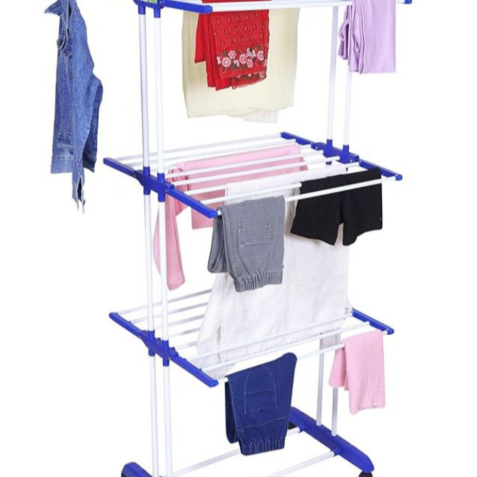A 3-layer cloth rack is a freestanding laundry drying and storage solution designed to provide three levels (tiers) of hanging space for clothes, towels, socks, and other garments. It’s usually made of metal tubing (often powder-coated steel or stainless steel) with plastic fittings for durability and rust resistance. Many models are foldable and mobile, making them ideal for both indoor and outdoor use, including balconies, laundry rooms, bedrooms, or patios.