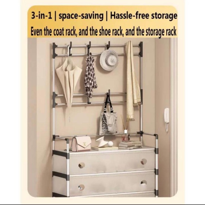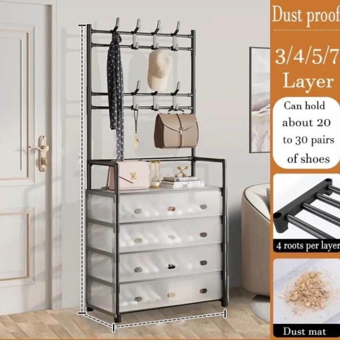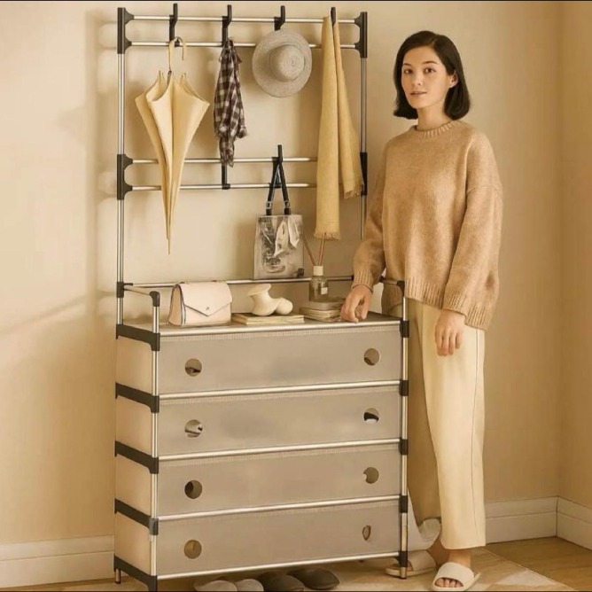 Keep your home neat and organized with this Multi-Functional Cloth Hanger Organizer & Dustproof Shoe Storage Rack. Designed with a strong metal frame and a 4-layer vertical structure, it offers reliable storage for shoes, slippers, bags, and daily essentials.