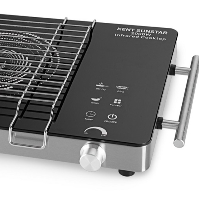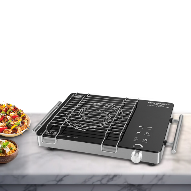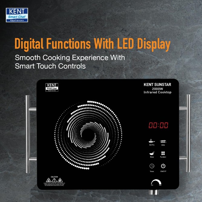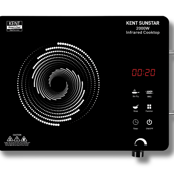 Presenting KENT Sunstar Infrared Cooktop which replaces gas burners. It is a 2000W cooktop that’s developed on advanced infrared technology. This energy efficient appliance has 3 preset functions that let you cook your favourite dish with just a simple touch of a button. It comes with a stainless steel grill stand which protects the microcrystalline glass top and is ideal for BBQ & Roast. Designed with digital functions and LED display.It is made of high quality ceramic infrared heating element that ensures durability and elegance. Furthermore, an auto shut-off feature makes this appliance completely safe to use.