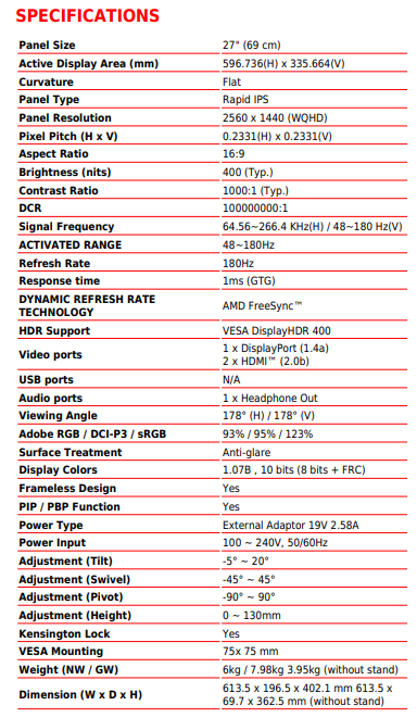 Visualize your victory with MSI MAG 274QRFW gaming monitor. Equipped with a 180hz Refresh rate, 1ms GTG response time panel, MAG 274QRFW will give you the competitive edge you need to take down your opponents. The WQHD (2560x1440) high resolution will let you experience the mesmerizing images. Enjoy extremely smooth, tear-free gameplay with built-in Adaptive-Sync technology when paired with your GPU for ultra-smooth gameplay.