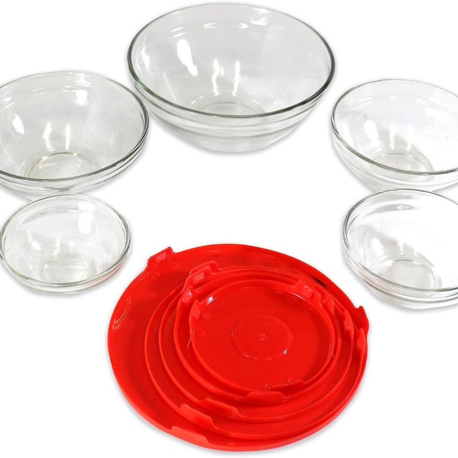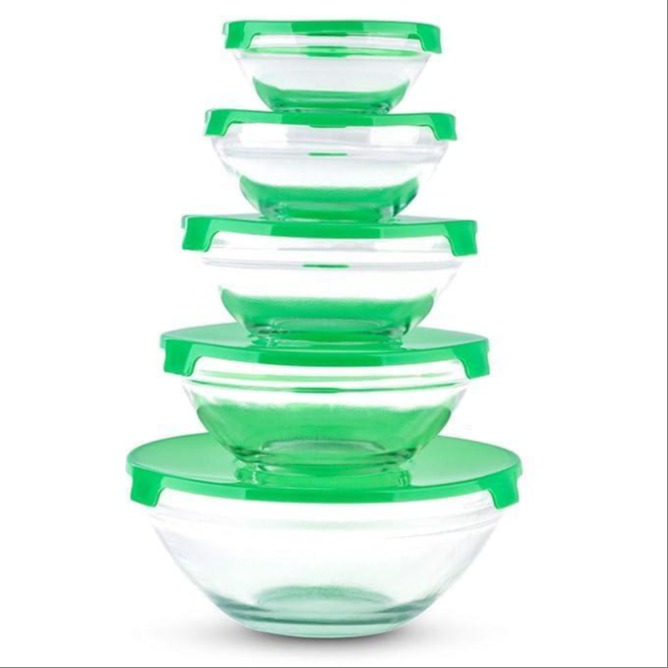 Elegant and practical, this 5-piece glass bowl set is perfect for everyday use in your kitchen. Made from durable, high-quality glass, these bowls are ideal for mixing, serving, and storing food. Their transparent design allows easy visibility of contents, while the nesting feature saves space in your cabinets.
