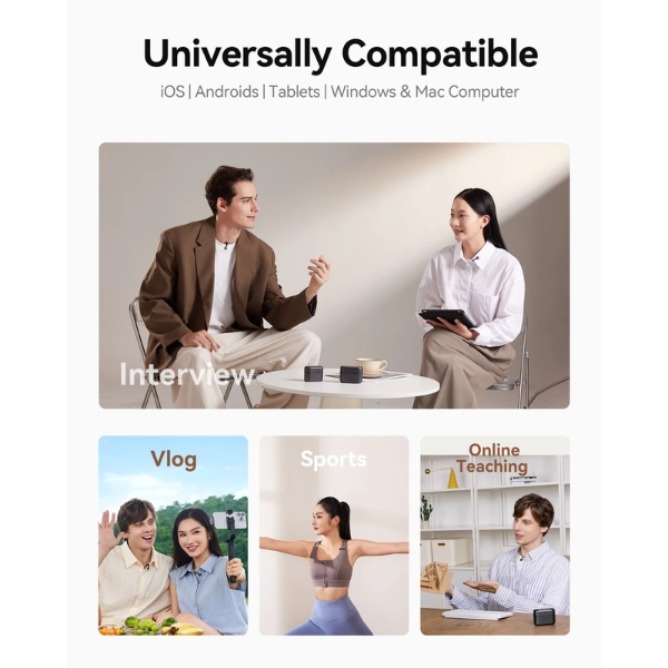 Connectivity / Range: Up to 300m wireless range, RF interference-resistant circuit, USB-C + 3.5mm outputs, supports mobile, camera, PC & Mac