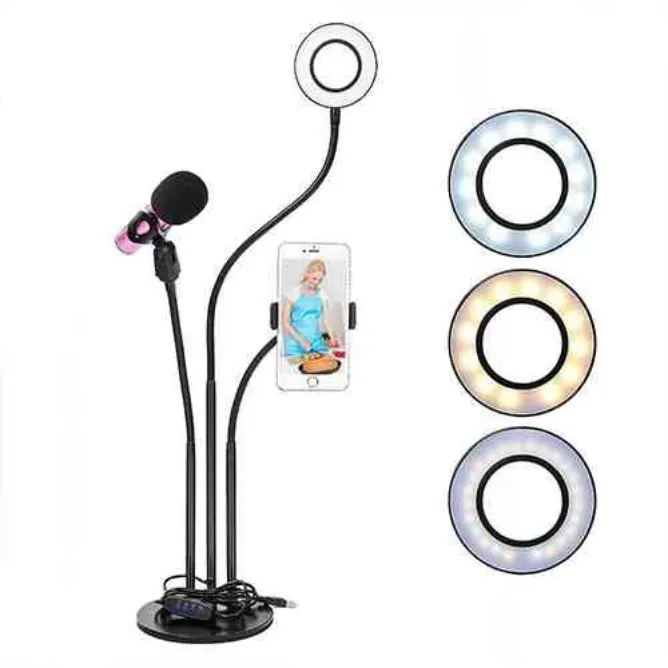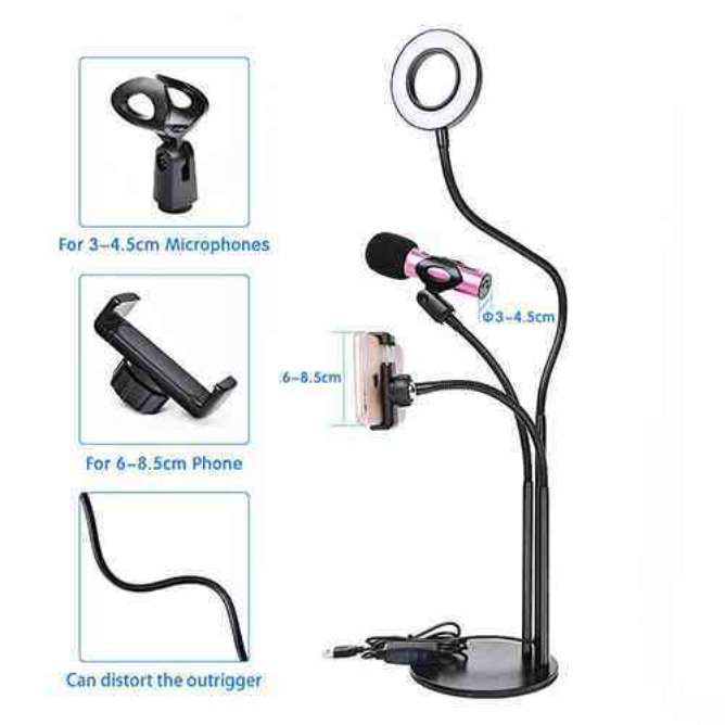 The 3-in-1 design combines the mobile phone holder, microphone holder, and lamp, using the universal adjustment metal hose that you can bend at will, choose the angle you are satisfied with.