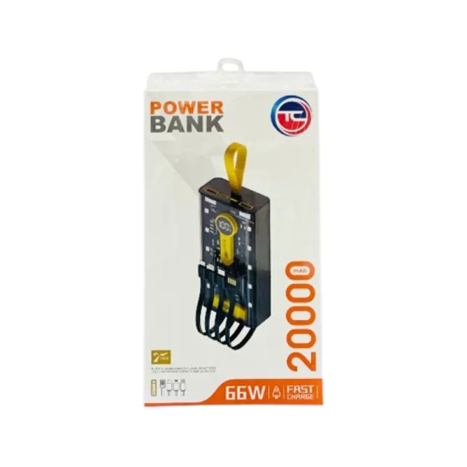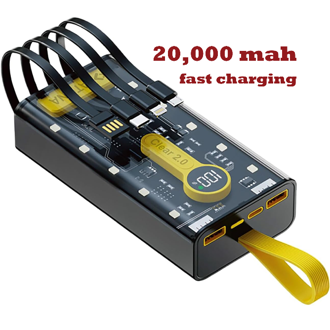 This is a 66W fast-charging, transparent power bank with built-in cables.