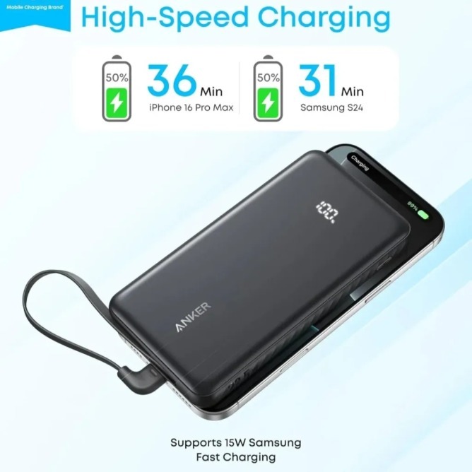 Fast 22.5W output from the built-in cable, USB-C port, or USB-A port ensures quick recharges—such as hitting 50% on many Android phones in roughly 30 minutes—making it practical for busy users. It handles up to three devices at once without major speed drops, thanks to intelligent power distribution.